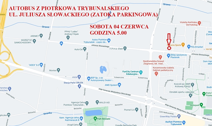 Wyjazd z Piotrkowa Trybunalskiego parking zatoka autobusowa na ul. Juliusza Słowackiego godzina 5.00 - prosimy wszystkich o przybycie na miejsce zbiórki nie później niż o godzinie 4.45.