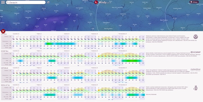 Modeli pogodowych jest bardzo dużo. Poniżej znajdziecie opis kilku przykładowych. Mamy zarówno te dostępne za darmo, jak i modele komercyjne. My oczywiście skupimy się na tych darmowych. W menu strony abordaż meteo macie linki do trzech stron z których polecamy korzystać. Oczywiście każda z nich oferuje także aplikacje na smartfony. Ciekawą funkcjonalność posiada Windy, możecie bowiem na bieżąco porównywać pogodę uzyskaną z czterech modeli.